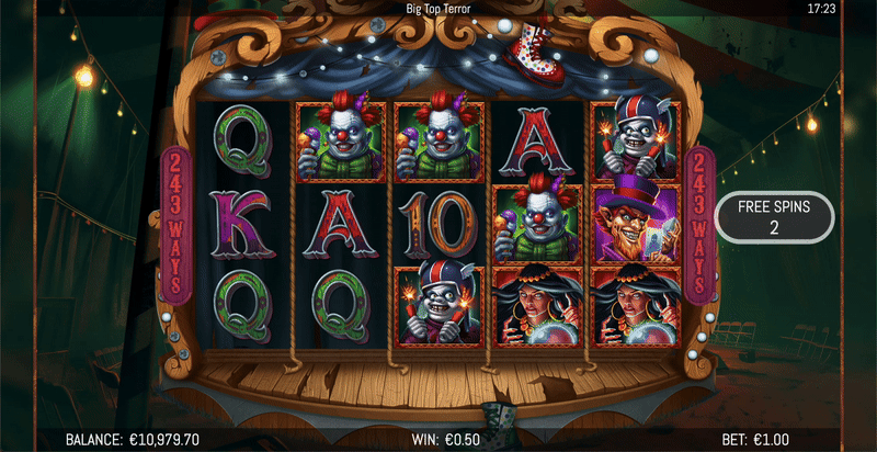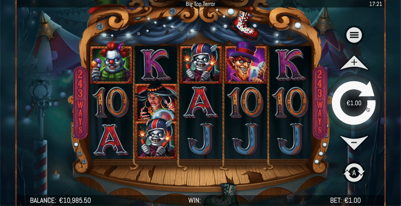 Big Top Terror is a creepy circus themed 5x3 slot game featuring 243 pay ways and a bonus feature with sticky wilds, which stack as multipliers.